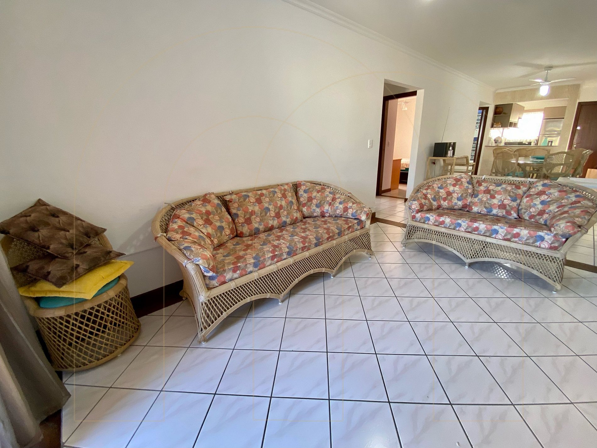 APTO 03 dorm. sendo 01 suíte c/ ar condicionado, 1 dorm. de casal com ventilador de teto, 1 dorm. c/ 1 triliche c/ ventilador de teto, 1 colchão de casal extra, 02 banheiros( 1 banh. da suíte + 1 social completo) cozinha completa, máquina de lavar, sacada com churrasqueira, sala de estar e jantar integradas c/ ar condicionado e televisor.
