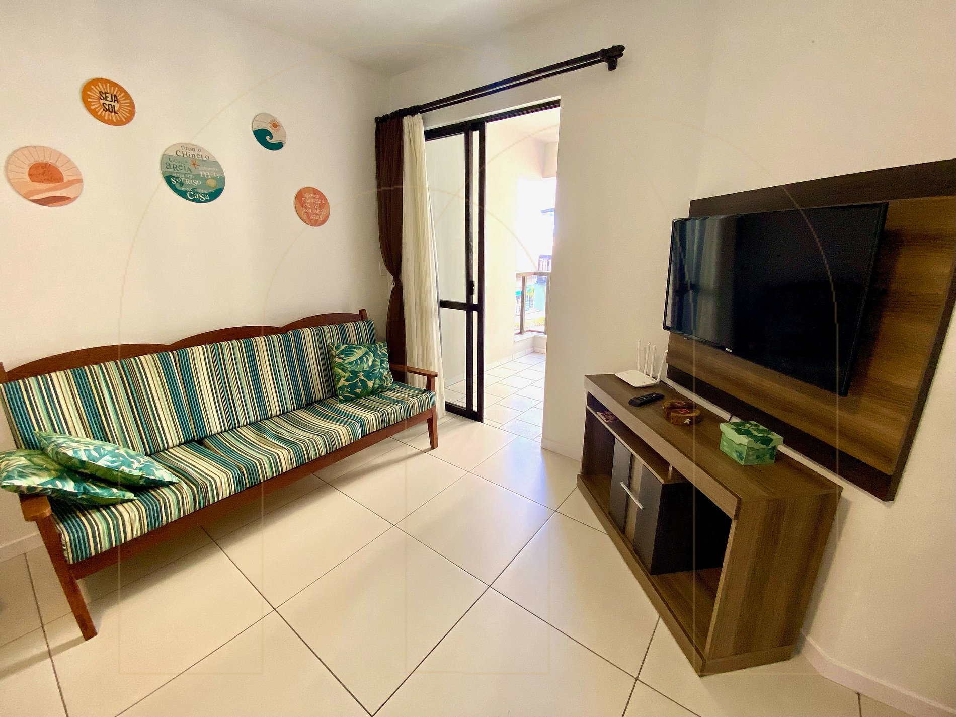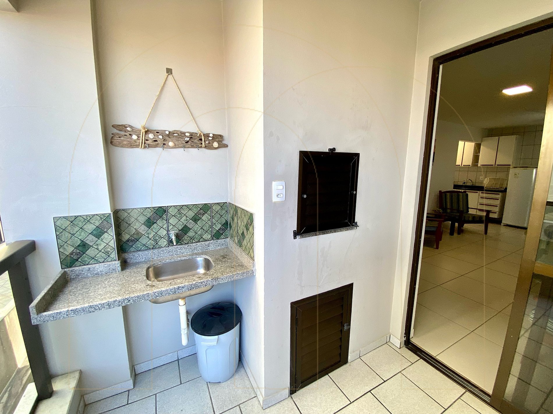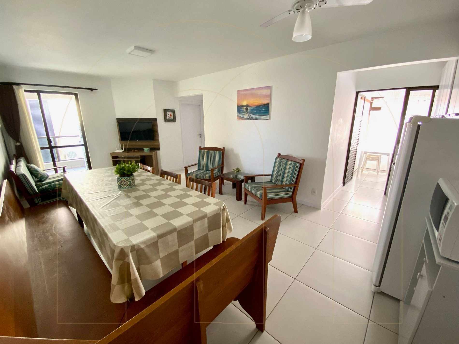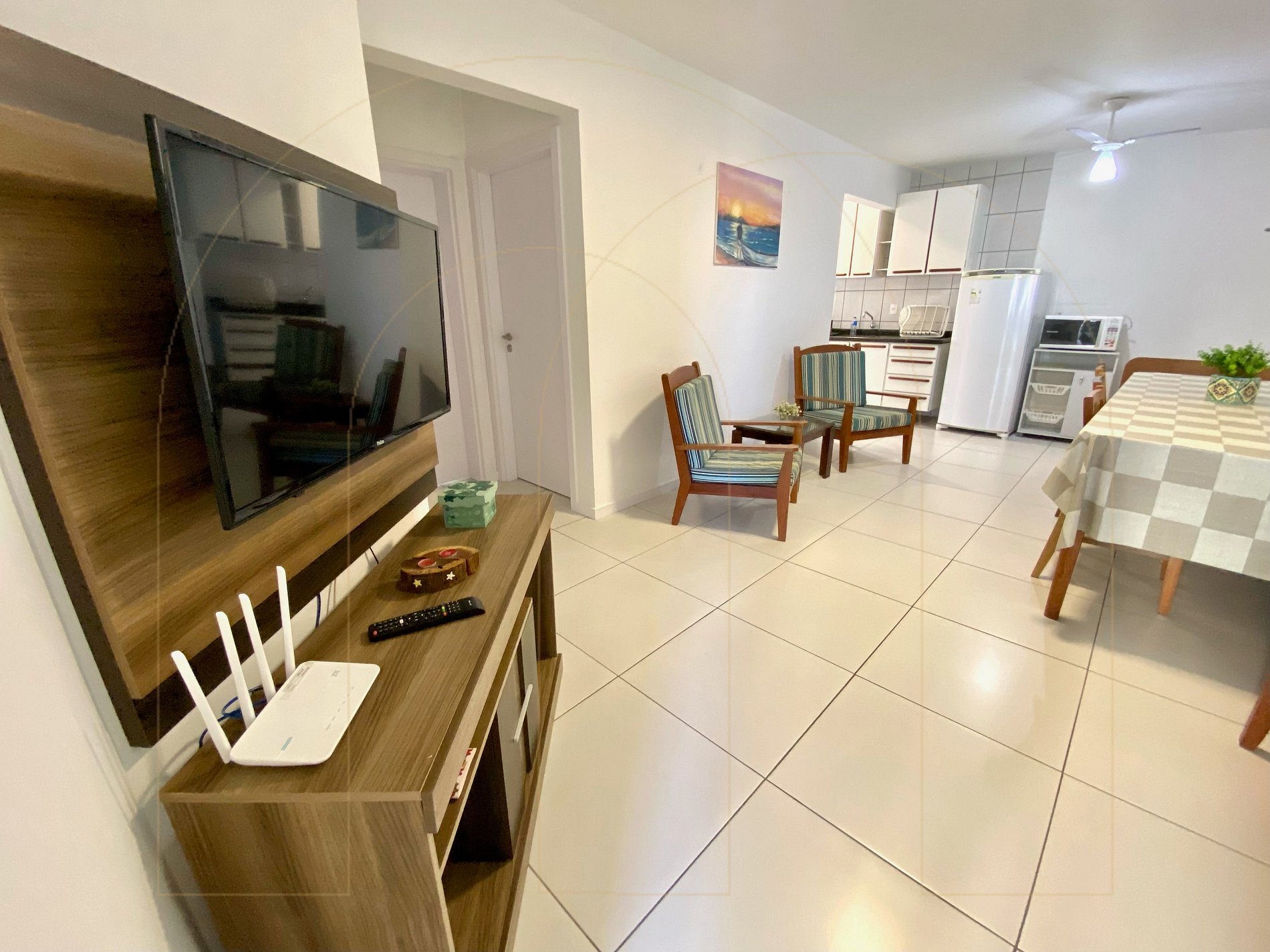 Apartamento 02 dormitórios com ar condicionado sendo 01 suíte, 02 banheiros, cozinha completa, área de serviço com máquina de lavar, sala de estar com televisor, sacada com churrasqueira.